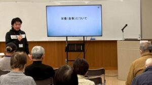 後半では、リハビリテーション学科3専攻の教員による、測定会1回目と2回目の結果を比較したフィードバックが行われました。理学療法学専攻からは、宮﨑宣丞助教による、歩く速さや握力などの「運動」の結果についての説明とともに、健康寿命延伸の取り組み例として阿蘇市介護予防体操が紹介されました。作業療法学専攻からは、宮田浩紀講師による、「社会参加」の結果から、現状の把握をしたうえで、フレイル予防や認知機能向上の重要性についてご説明いただきました。言語聴覚学専攻のフィードバックでは、松原慶吾准教授から、「栄養(食事)」の結果に関しての説明と、口腔体操などの予防活動を継続する意義についてお話をいただきました。