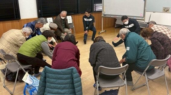 【予防活動を本学教員(宮﨑助教、山本良平准教授)が参加者に指導している様子】